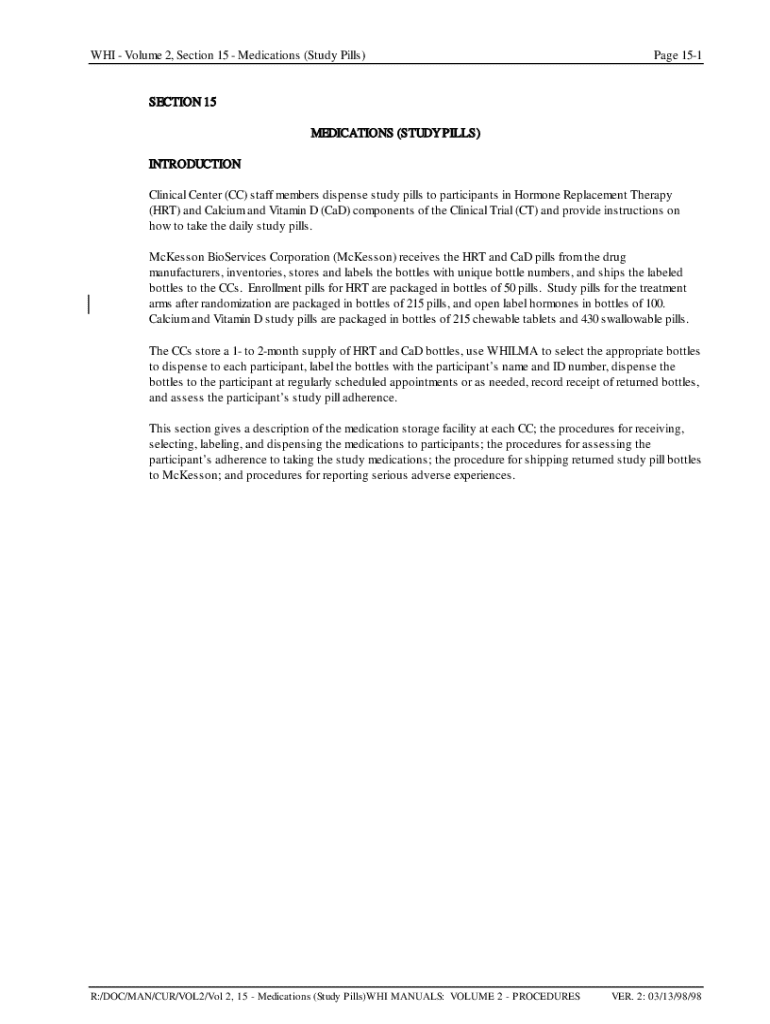 WHO Volume 2, Section 15 Medications (Study Pills)Page 151SECTION 15 MEDICATIONS (STUDY PILLS) INTRODUCTION Clinical Center (CC) staff members dispense study pills to participants in Hormone Replacement