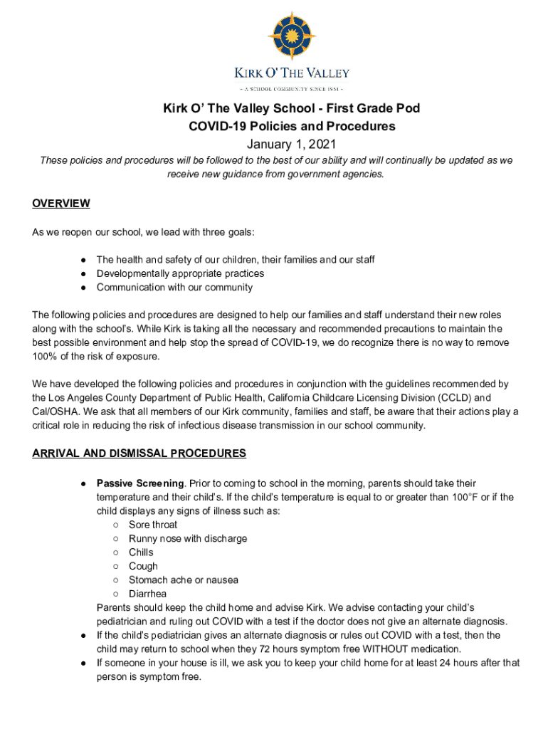 Kirk O The Valley School First Grade Pod COVID-19 Policies and Procedures January 1, 2021, These policies and procedures will be followed to the best of our ability and will continually be updated