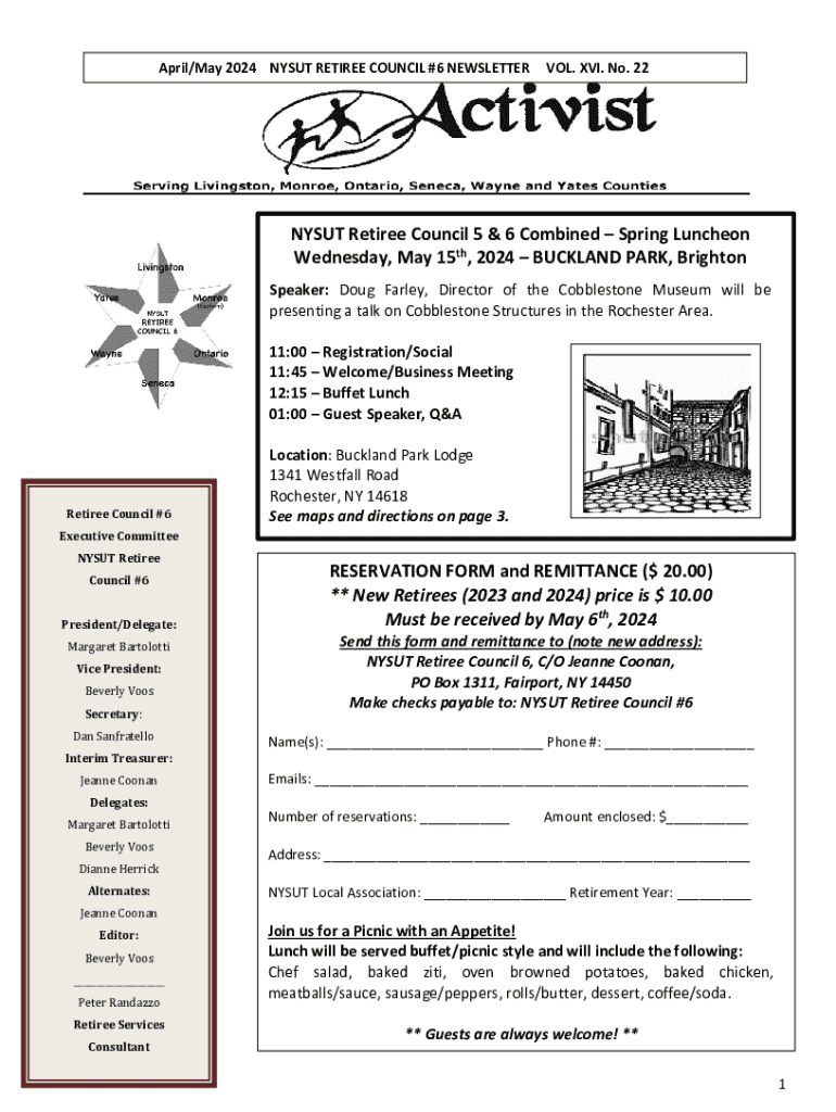 April/May 2024 NYSUT RETIREE COUNCIL #6 NEWSLETTERVOL. XVI. No. 22NYSUT Retiree Council 5 & 6 Combined Spring Luncheon Wednesday, May 15th, 2024 BUCKLAND PARK, Brighton Speaker: Doug Farley, Director
