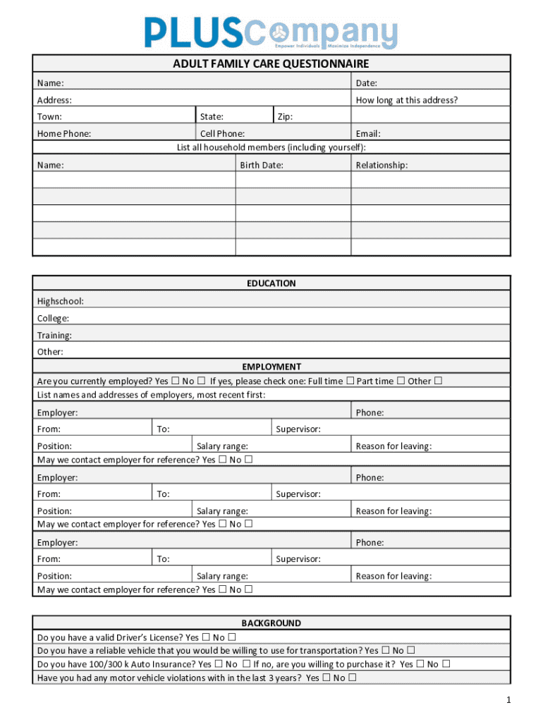 ADULT FAMILY CARE QUESTIONNAIRE Name:Date:Address:How long at this address? Town:State:Home Phone:Zip:Cell Phone: Email: List all household members (including yourself):Name:Birth Date:Relationship:EDUCATION