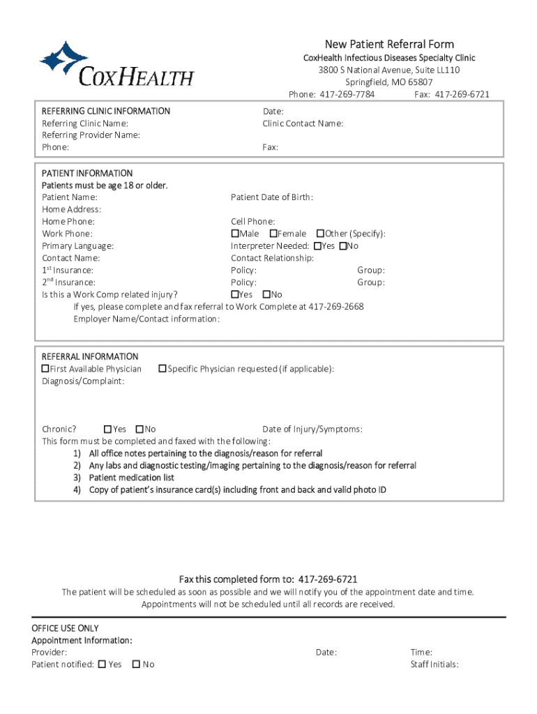 New Patient Referral FormCoxHealth Infectious Diseases Specialty Clinic 3800 S National Avenue, Suite LL110 Springfield, MO 65807 Phone: 4172697784 Fax: 4172696721 REFERRING CLINIC INFORMATION Referring