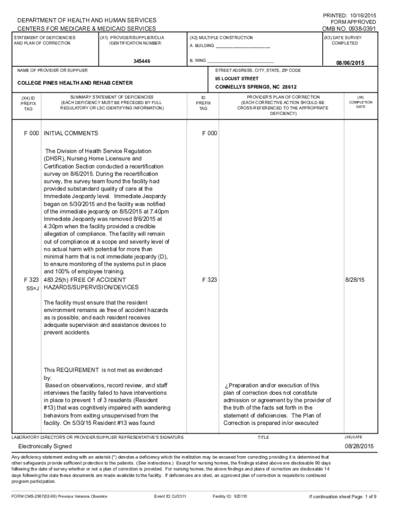AND PLAN OF CORRECTION(X1) PROVIDER/SUPPLIER/CIA