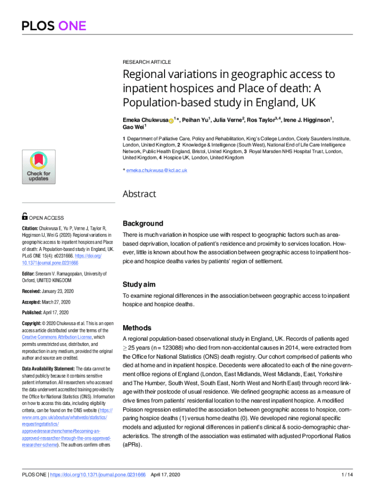 Get the free Regional variations in geographic access to inpatient hospices and Place of death