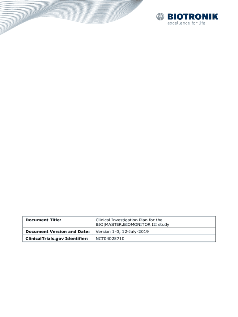 BIO|MASTER.MONITOR III studyDocument Version and Date:Version 10, 12July2019ClinicalTrials.gov Identifier:NCT04025710Clinical Investigation Plan