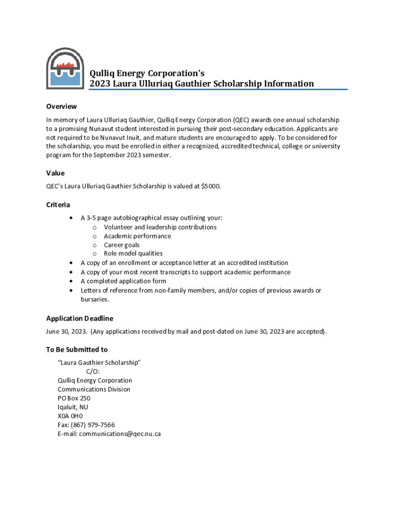 Students who meet the eligibility criteria can apply for the Laura Ulluriaq Gauthier Scholarship.