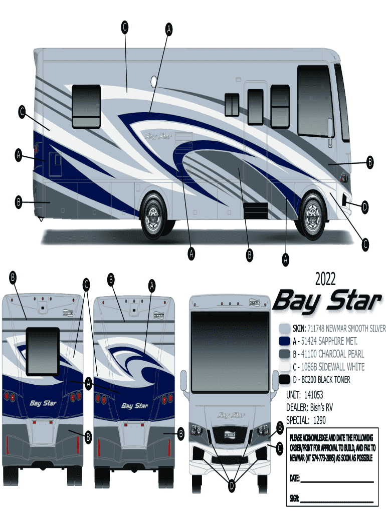 CACABBDA BCBBAA2022 SKIN: 711748 NEWMAR SMOOTH SILVER A 51424 SAPPHIRE MET. B 41100 CHARCOAL PEARL C 1086B SIDEWALL WHITE D BC200 BLACK TONERABCBBC DUNIT: 141053 DEALER: Bishs RV SPECIAL: 1290 PLEASE