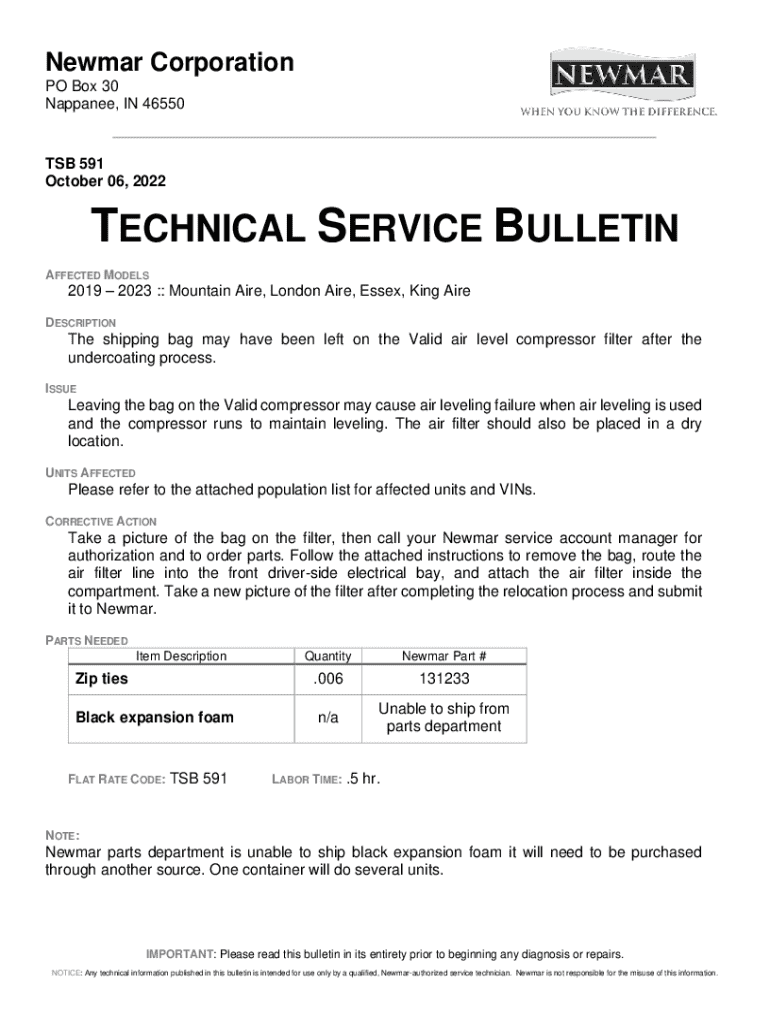 Newman Corporation PO Box 30 Japanese, IN 46550TSB 591 October 06, 2022TECHNICAL SERVICE BULLETIN AFFECTED MODELS2019 2023 :: Mountain Are, London Are, Essex, King Are Description shipping bag may