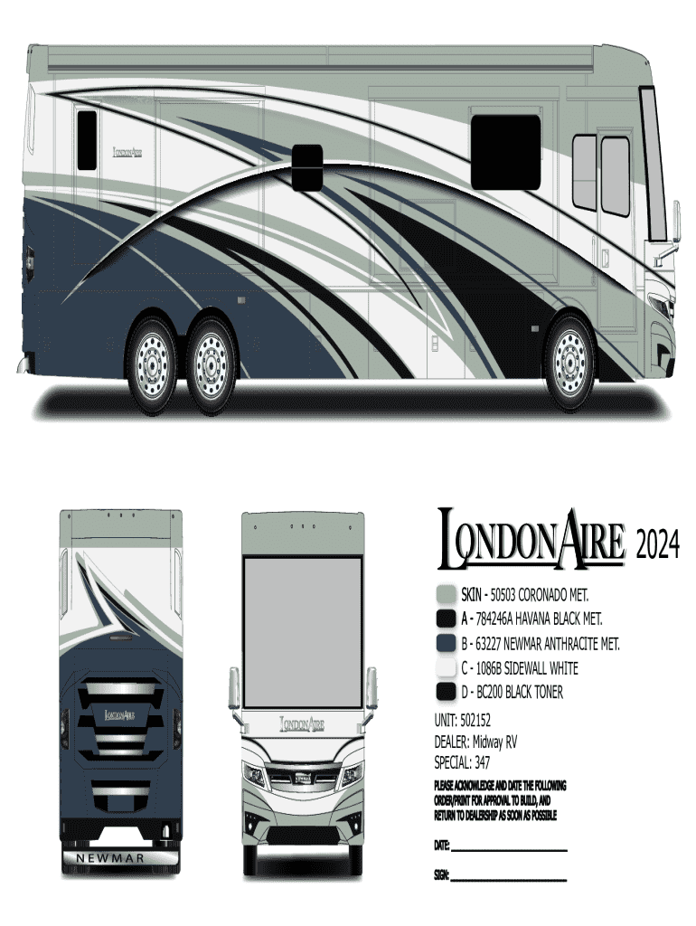 2024 SKIN 50503 CORONADO MET. A 784246A HAVANA BLACK MET. B 63227 NEWMAR ANTHRACITE MET. C 1086B SIDEWALL WHITE D BC200 BLACK TONER UNIT: 502152 DEALER: Midway RV SPECIAL: 347 PLEASE ACKNOWLEDGE AND