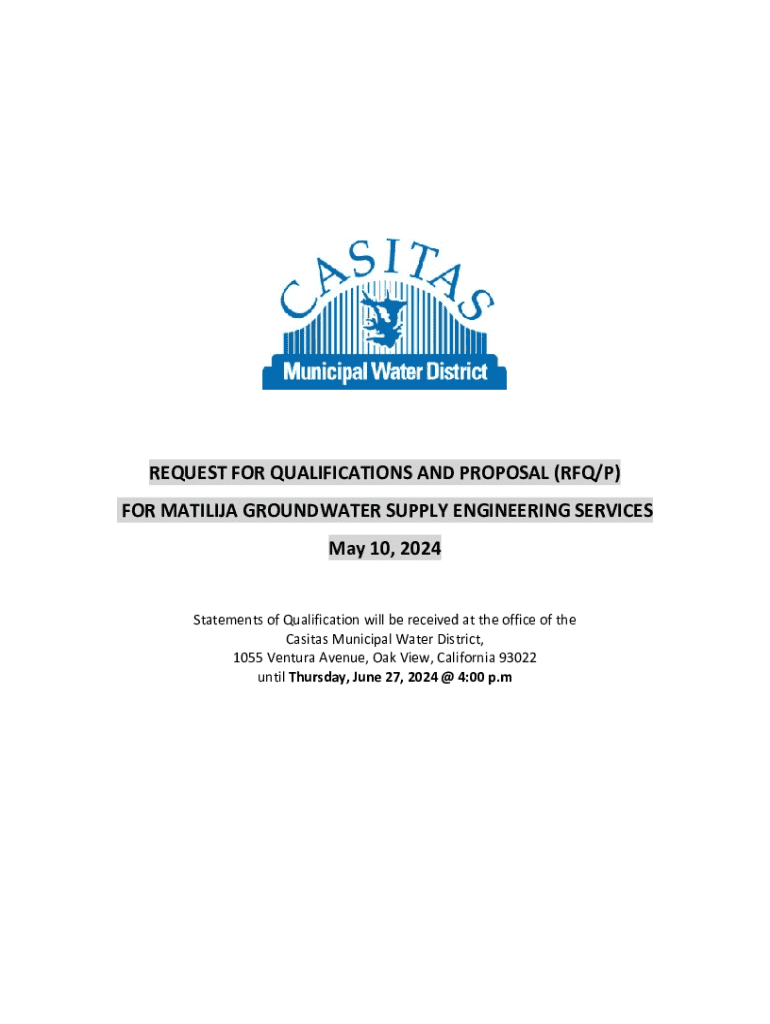 REQUEST FOR QUALIFICATIONS AND PROPOSAL (RFQ/P) FOR MATILDA GROUNDWATER SUPPLY ENGINEERING SERVICES May 10, 2024, Statements of Qualification will be received at the office of the Capital Municipal