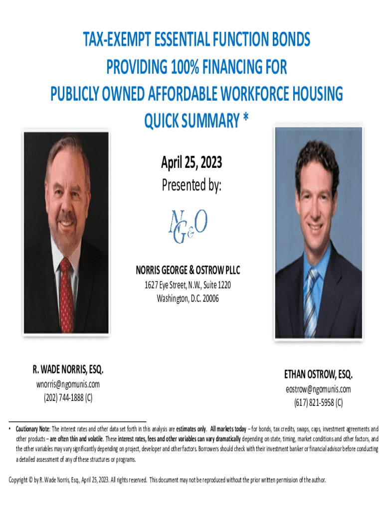 TAX-EXEMPT ESSENTIAL FUNCTION BONDS PROVIDING 100% FINANCING FOR PUBLICLY OWNED AFFORDABLE WORKFORCE HOUSING QUICK SUMMARY * April 25, 2023, Presented by:NORRIS GEORGE & STRAW LLC 1627 Eye Street,