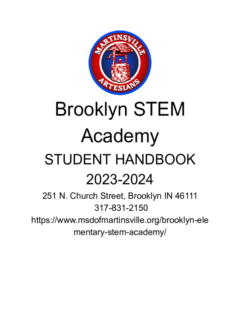 Brooklyn STEM Academy STUDENT HANDBOOK 20232024 251 N. Church Street, Brooklyn IN 46111 3178312150 https://www.msdofmartinsville.org/brooklynele mentarystemacademy/Table of Contents MSD of Martinsville