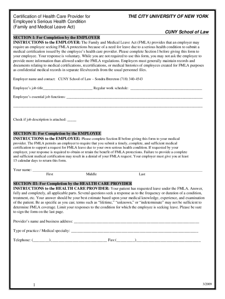 Certification of Health Care Provider for Employees Serious Health Condition (Family and Medical Leave Act)THE CITY UNIVERSITY OF NEW YORKCUNY School of Law SECTION I: For Completion by the EMPLOYER