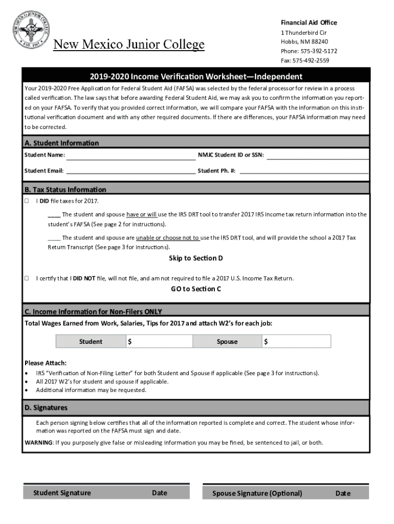 Financial Aid Office 1 Thunderbird Cir Hobbs, NM 88240 Phone: 5753925172 Fax: 575492255920192020 Income Verification WorksheetIndependent Your 20192020 Free Application for Federal Student Aid (FAFSA)