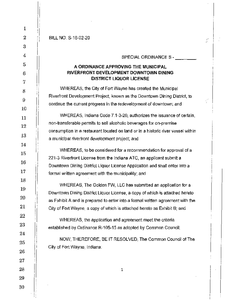 12BILL NO. S160220.34 56 7 8 9SPECIAL ORDINANCE S _ _ __ A ORDINANCE APPROVING THE MUNICIPAL RIVERFRONT DEVELOPMENT DOWNTOWN DINING DISTRICT LIQUOR LICENSEWHEREAS, the City of Fort Wayne has created