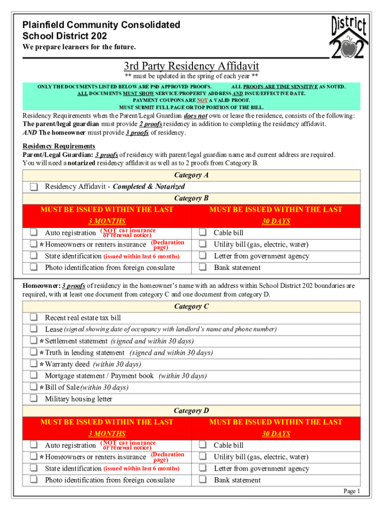 Plainfield Community Consolidated School District 202 We prepare learners for the future.3rd Party Residency Affidavit ** must be updated in the spring of each year **ONLY THE DOCUMENTS LISTED BELOW