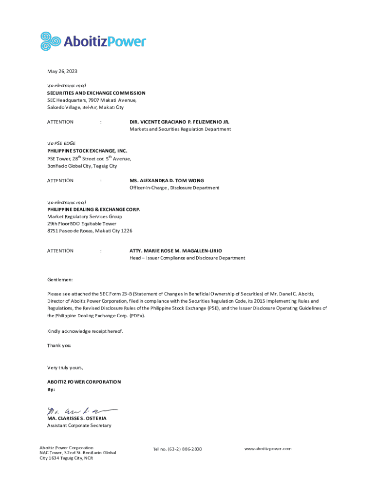 May 26, 2023 via electronic mail SECURITIES AND EXCHANGE COMMISSION SEC Headquarters, 7907 Makati Avenue, Salcedo Village, BelAir, Makati City ATTENTION:DIR. VICENTE GRACIANO P. FELIZMENIO JR. Markets