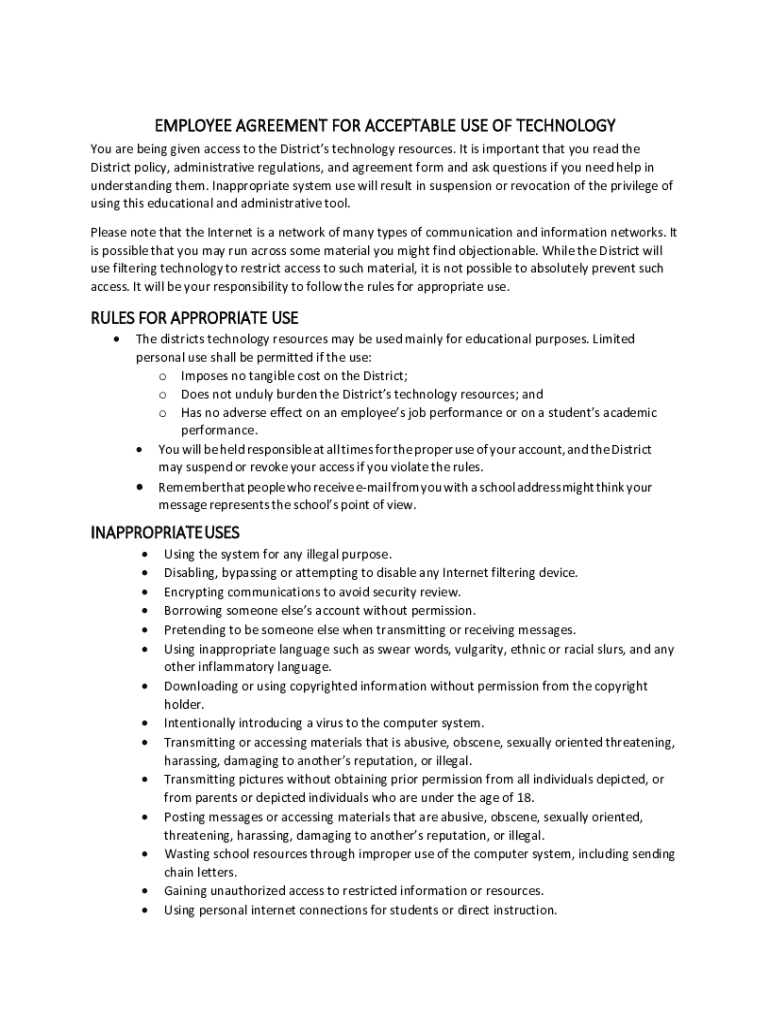 EMPLOYEE AGREEMENT FOR ACCEPTABLE USE OF TECHNOLOGY You are being given access to the Districts technology resources. It is important that you read the District policy, administrative regulations,