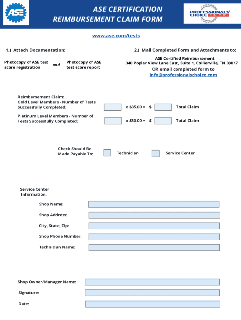 The purpose of ASE certification reimbursement claim is to help technicians offset the costs of obtaining and maintaining ASE certification.