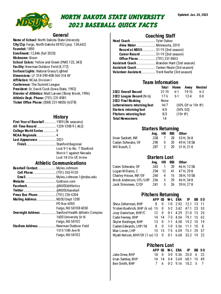 Updated: Jan. 24, 2023North Dakota State University 2023 Baseball Quick Facts Generalize of School: North Dakota State University City/Zip: Fargo, North Dakota 58102 (pop. 124,662) Founded: 1890 Enrollment: