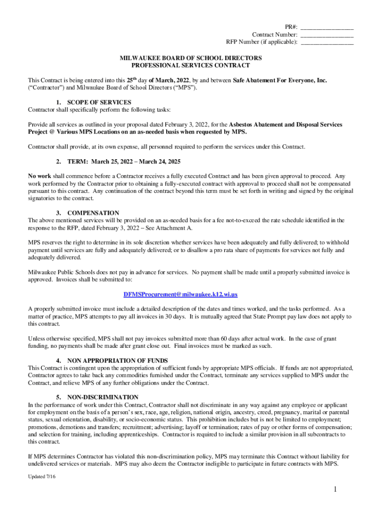 PR#: ___ Contract Number: ___ RFP Number (if applicable): ___ MILWAUKEE BOARD OF SCHOOL DIRECTORS PROFESSIONAL SERVICES CONTRACT This Contract is being entered into this 25th day of March, 2022, by