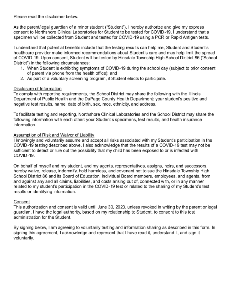 Please read the disclaimer below. As the parent/legal guardian of a minor student (Student), I hereby authorize and give my express consent to North shore Clinical Laboratories for Student to be tested