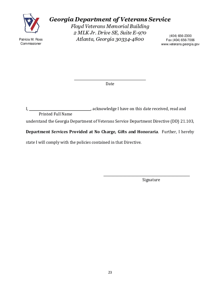 Georgia Department of Veterans Service Patricia M. Ross Commissioner Floyd Veterans Memorial Building 2 MLK Jr. Drive SE, Suite E970 Atlanta, Georgia 303344800(404) 6562300 Fax (404) 6567006 www.veterans.georgia.gov___
