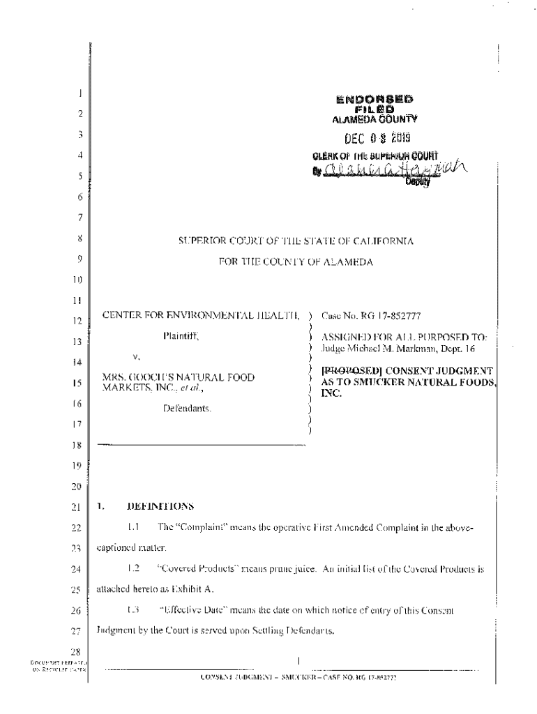 1 22.INTRODUCTION 2.1The Parties to this Consent Judgment are the Center for Environmental Health, a3California nonprofit corporation (CEH) and Smucker Natural Foods, Inc. (Settling4Defendant). CEH
