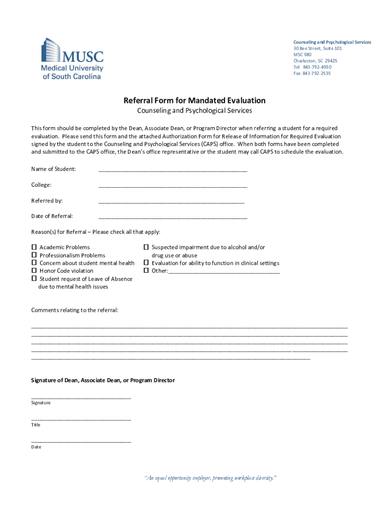 Counseling and Psychological Services 30 Bee Street, Suite 101 MSC 980 Charleston, SC 29425 Tel 8437924930 Fax 8437922535Referral Form for Mandated Evaluation Counseling and Psychological Services