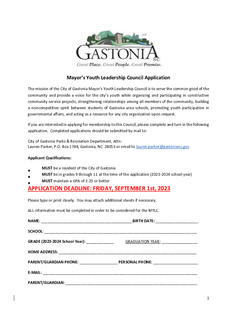 Mayors Youth Leadership Council Application The mission of the City of Gastonia Mayors Youth Leadership Council is to serve the common good of the community and provide a voice for the citys youth