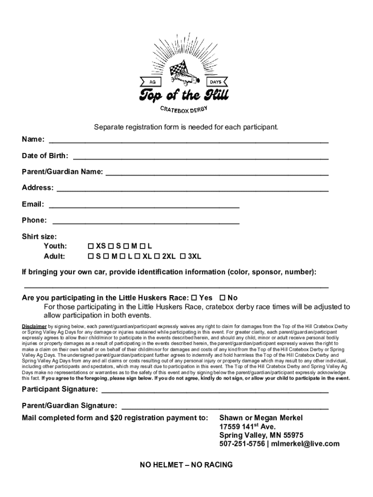 Separate registration form is needed for each participant. Name: ___ Date of Birth: ___ Parent/Guardian Name: ___ Address: ___ Email: ___ Phone: ___ Shirt size: Youth: Adult: XS S M L S M L XL 2XL