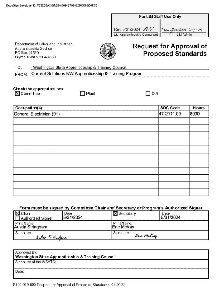 For L&I Staff Use OnlyRec 5/31/2024 ______L&I Apprenticeship ConsultantL&I AdminDepartment of Labor and Industries Apprenticeship Section PO Box 44530 Olympia WA 985044530TO:Request for Approval of