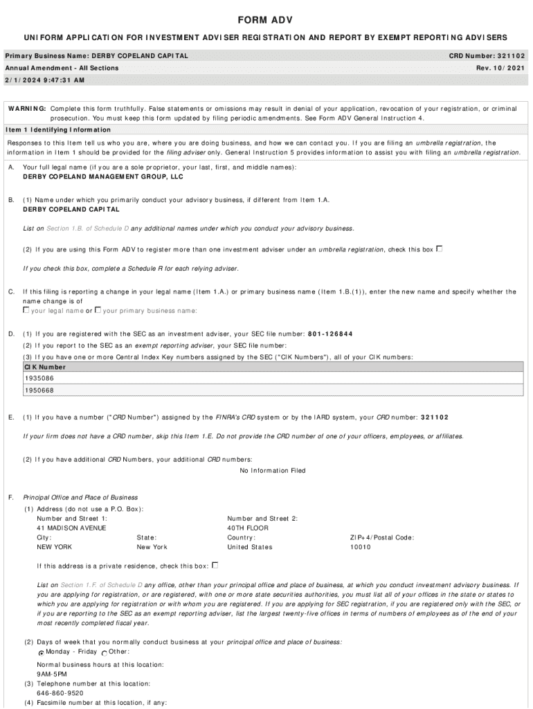 FORM ADV UNIFORM APPLICATION FOR INVESTMENT ADVISER REGISTRATION AND REPORT BY EXEMPT REPORTING ADVISERS Primary Business Name: DERBY COPELAND CAPITALCRD Number: 321102Annual Amendment All SectionsRev.