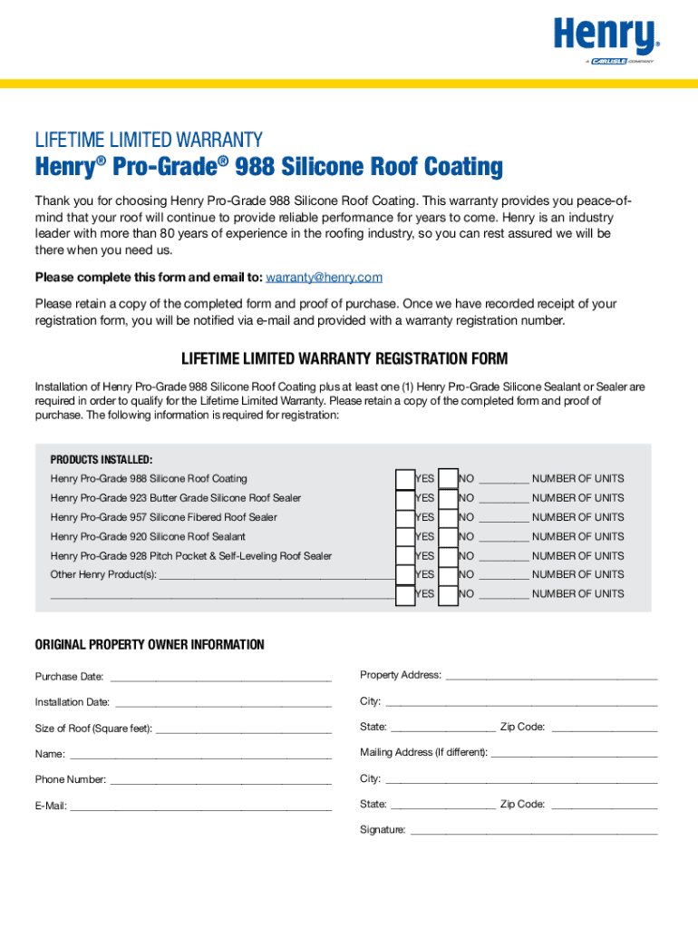 LIFETIME LIMITED WARRANTYHenry ProGrade 988 Silicone Roof Coating Thank you for choosing Henry ProGrade 988 Silicone Roof Coating. This warranty provides you peaceofmind that your roof will continue