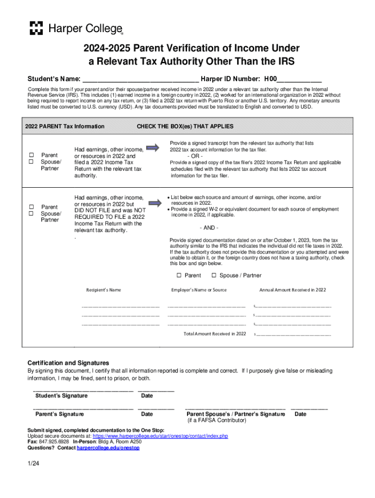 20242025 Parent Verification of Income Under a Relevant Tax Authority Other Than the IRS Students Name: ___ Harper ID Number: H00___ Complete this form if your parent and/or their spouse/partner received