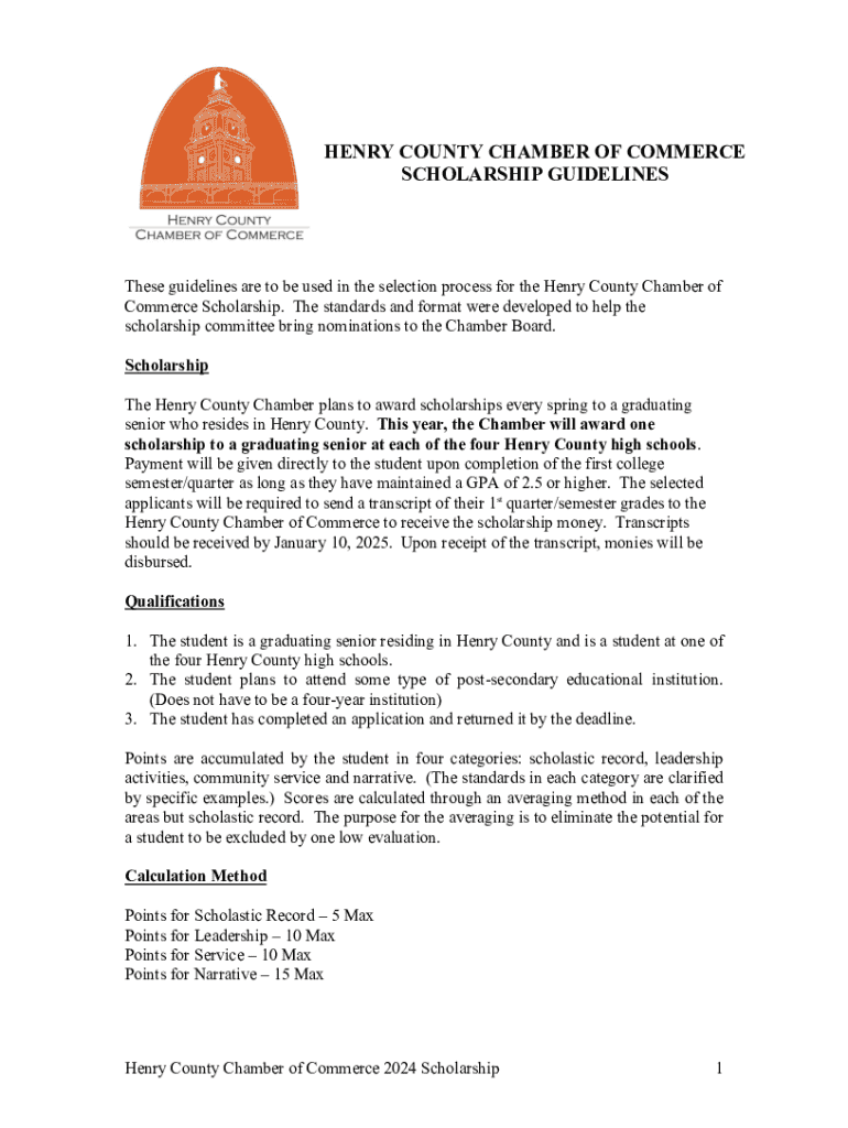 HENRY COUNTY CHAMBER OF COMMERCE SCHOLARSHIP GUIDELINESThese guidelines are to be used in the selection process for the Henry County Chamber of Commerce Scholarship. The standards and format were