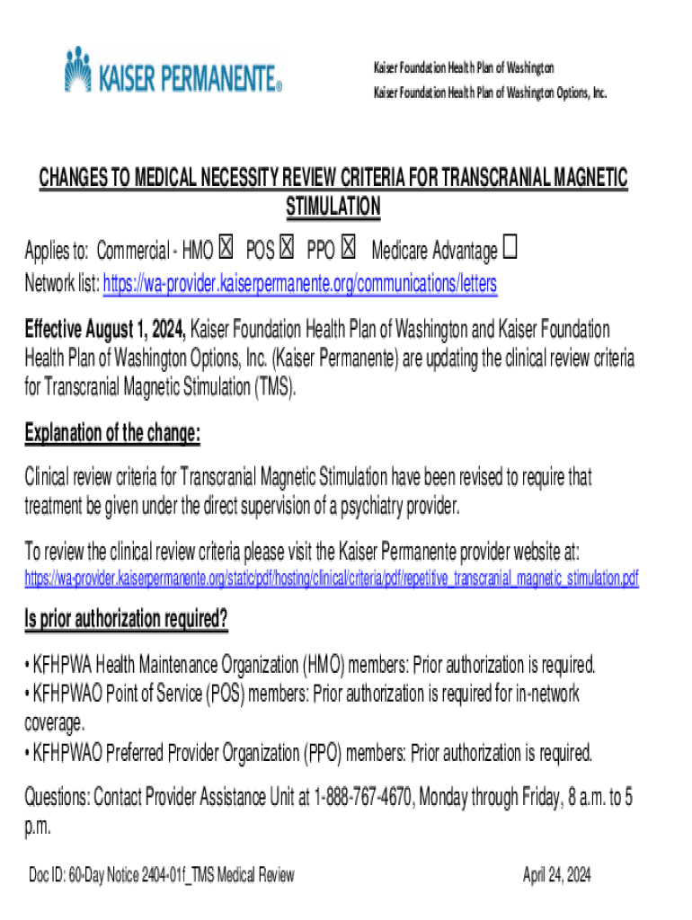 Kaiser Foundation Health Plan of Washington Kaiser Foundation Health Plan of Washington Options, Inc. CHANGES TO MEDICAL NECESSITY REVIEW CRITERIA FOR TRANSCRANIAL MAGNETIC STIMULATION Applies to: