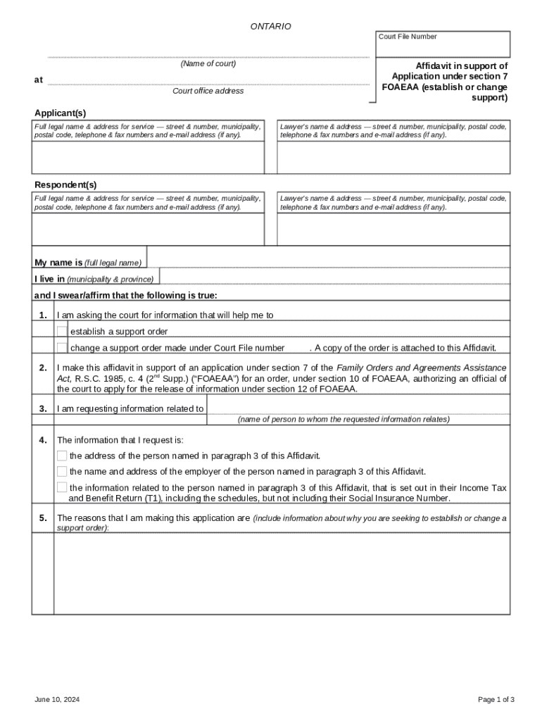 What is Affidavit in support of Application under section 7 FOAEAA (establish or change support) - ontariocourts on Form?