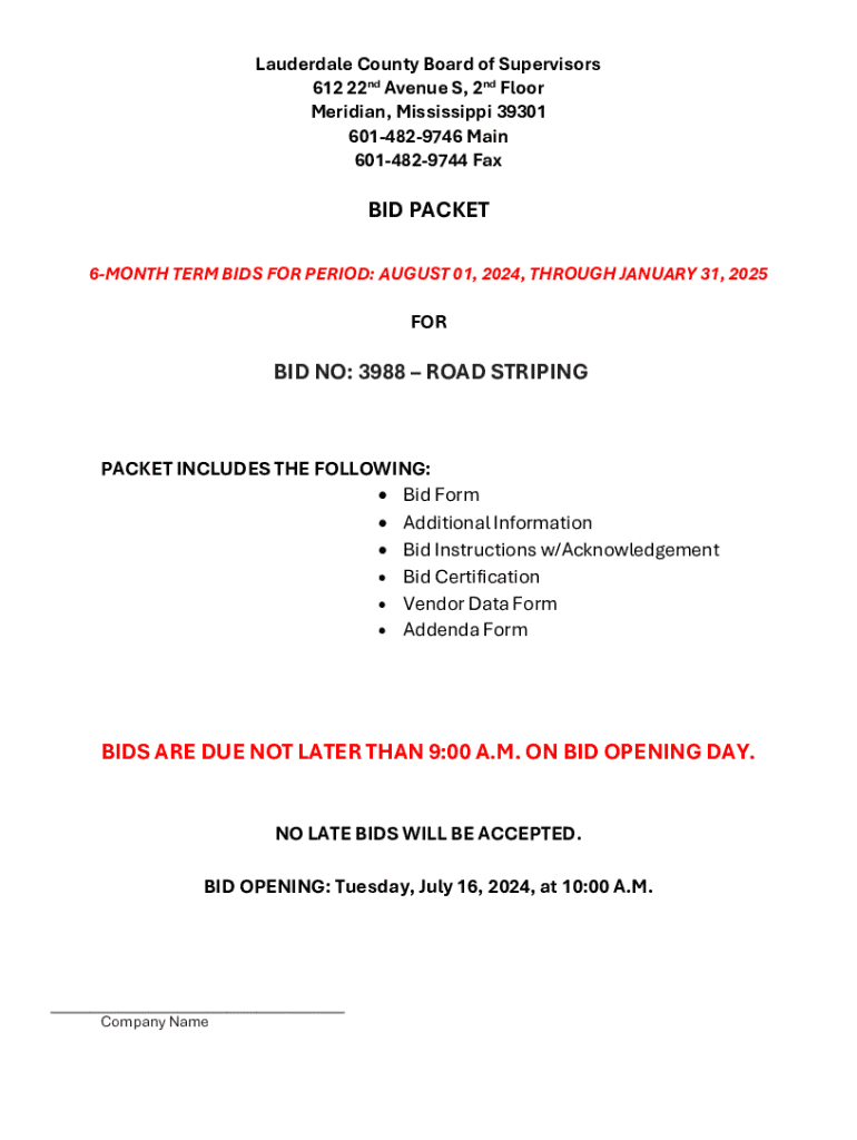 Lauderdale County Board of Supervisors 612 22nd Avenue S, 2nd Floor Meridian, Mississippi 39301 6014829746 Main 6014829744 FaxBID PACKET 6MONTH TERM BIDS FOR PERIOD: AUGUST 01, 2024, THROUGH JANUARY