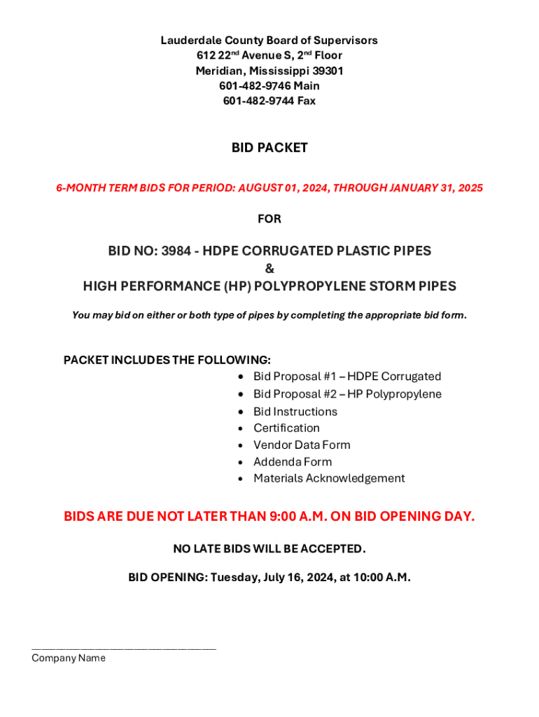 Lauderdale County Board of Supervisors 612 22nd Avenue S, 2nd Floor Meridian, Mississippi 39301 6014829746 Main 6014829744 Fax BID PACKET 6MONTH TERM BIDS FOR PERIOD: AUGUST 01, 2024, THROUGH JANUARY