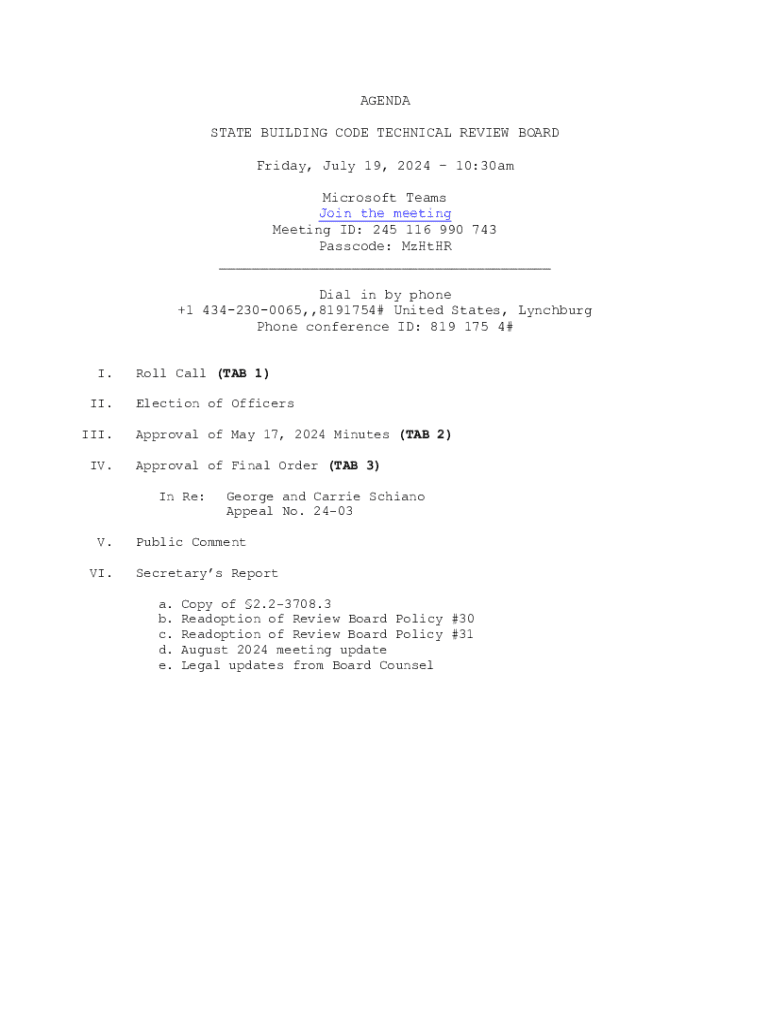AGENDA STATE BUILDING CODE TECHNICAL REVIEW BOARD Friday, July 19, 2024 10:30am Microsoft Teams Join the meeting Meeting ID: 245 116 990 743 Passcode: MzHtHR ___ Dial in by phone +1 4342300065,,8191754#