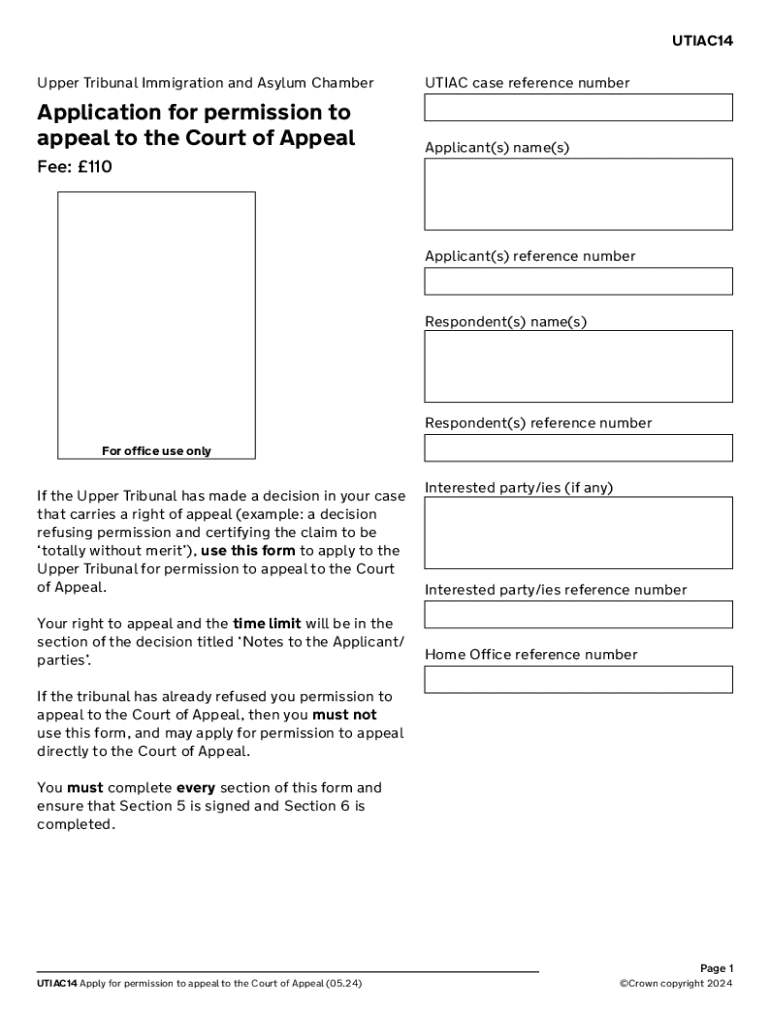 UTIAC14 Upper Tribunal Immigration and Asylum ChamberUTIAC case reference numberApplication for permission to appeal to the Court of AppealApplicant(s) name(s)Fee: 110Applicant(s) reference numberRespondent(s)