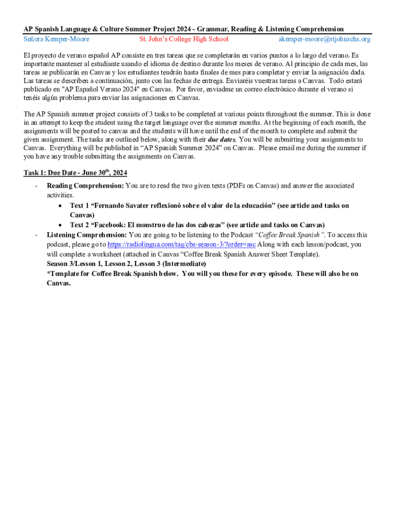 AP Spanish Language & Culture Summer Project 2024 Grammar, Reading & Listening Comprehension