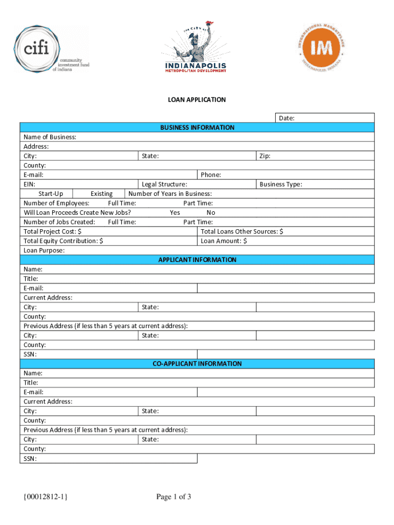 LOAN APPLICATION Date: BUSINESS INFORMATION Name of Business: Address: City: State: Zip: County: Email: Phone: EIN: Legal Structure: Business Type: StartUp Existing Number of Years in Business: Number