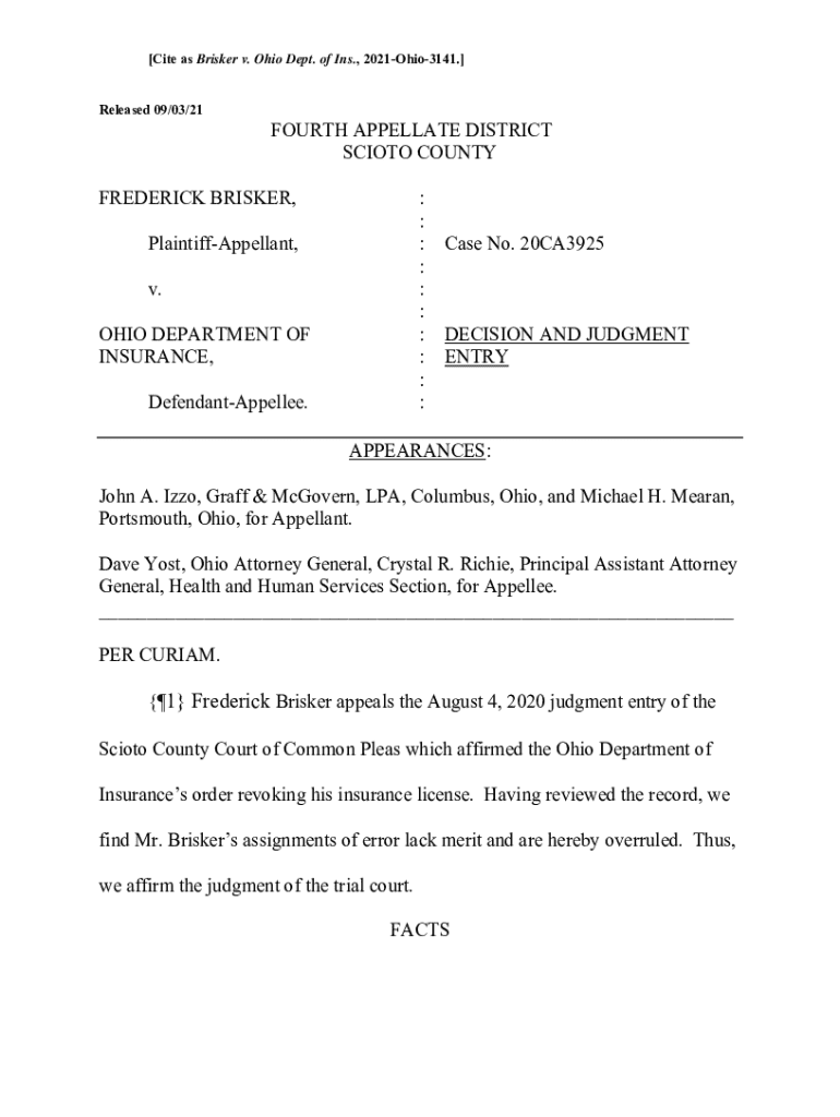 [Cite as Brisker v. Ohio Dept. of Ins., 2021Ohio3141.]Released 09/03/21FOURTH APPELLATE DISTRICT SCIOTO COUNTY FREDERICK BRISKER,: : : : : : : : : :PlaintiffAppellant, v. OHIO DEPARTMENT OF INSURANCE,