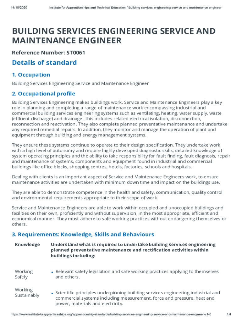14/10/2020Institute for Apprenticeships and Technical Education / Building services engineering service and maintenance engineerBUILDING SERVICES ENGINEERING SERVICE AND MAINTENANCE ENGINEER Reference