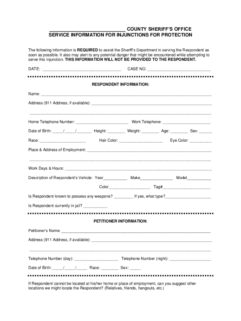 ___ COUNTY SHERIFFS OFFICE SERVICE INFORMATION FOR INJUNCTIONS FOR PROTECTION The following information is REQUIRED to assist the Sheriffs Department in serving the Respondent as soon as possible.