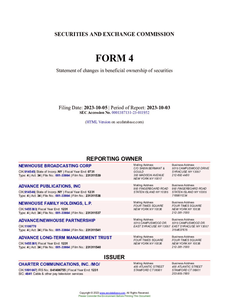 Get the free NEWHOUSE BROADCASTING CORP Form 4 Filed 2023-10-05. Accession Number