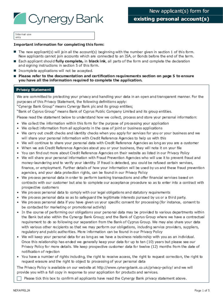 New applicant(s) form for existing personal account(s) Internal use onlyImportant information for completing this form:The new applicant(s) will join all the account(s) beginning with the number given