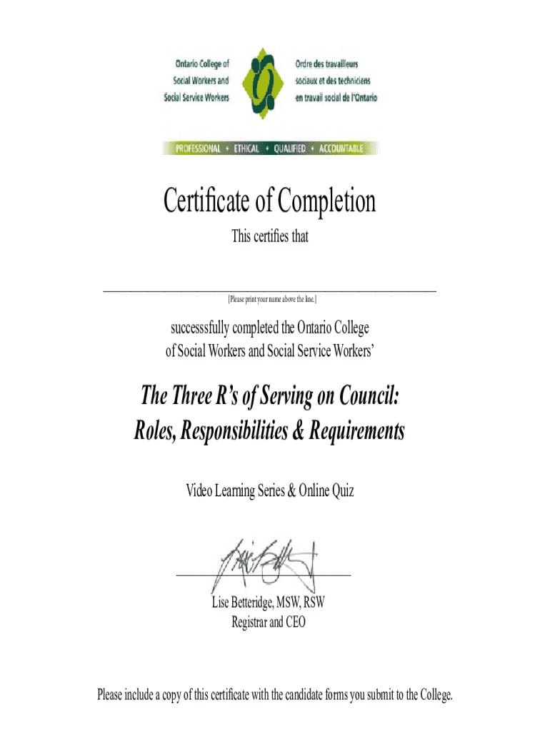 Certificate of Completion This certifies that___ [Please print your name above the line.]successsfully completed the Ontario College of Social Workers and Social Service WorkersThe Three Rs of Serving