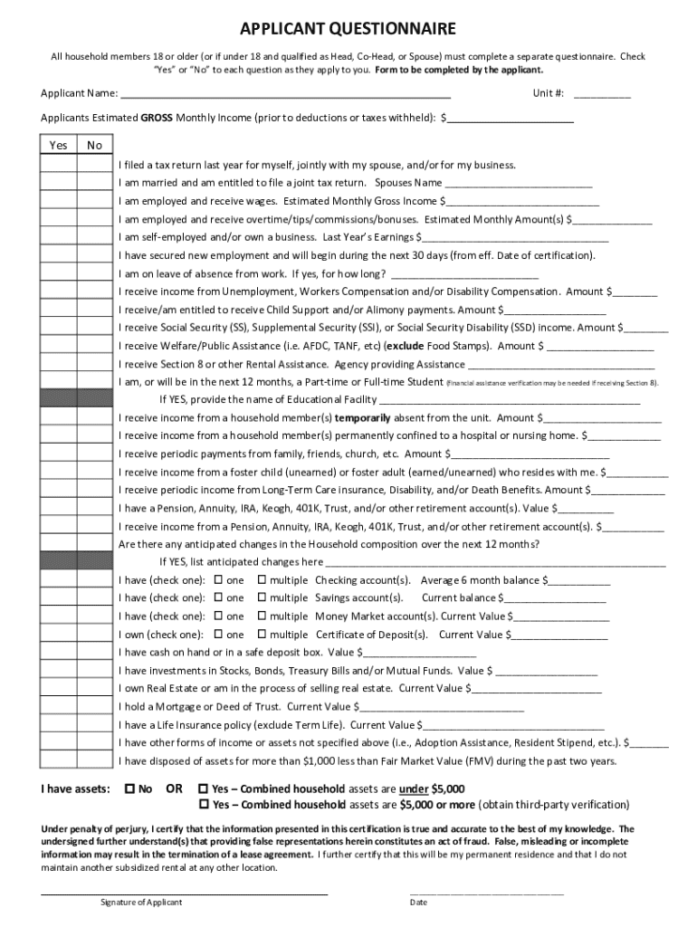 APPLICANT QUESTIONNAIRE All household members 18 or older (or if under 18 and qualified as Head, Colead, or Spouse) must complete a separate questionnaire. Check Yes or No to each question as they